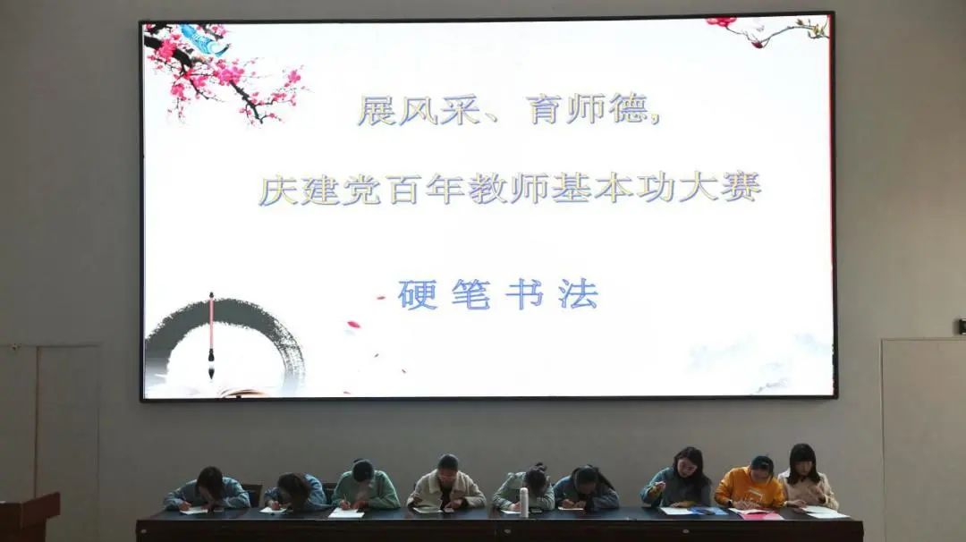 在比賽中,各參賽教師盡展風采、各顯神通。教師們的普通話朗讀紛紛圍繞建黨百年華誕主題展開,“有一首歌,在脈管里流淌,在心里頭銘刻,這首歌的名字叫做——沒有共產(chǎn)黨就沒有新中國”,在主持人馮曉雨的介紹下,7名老師齊聲朗誦《有一首歌》,聲情并茂,感人至深;書寫的硬筆書法則是筆走龍蛇,直而不顫,弧而不弱;說課則是將德育目標貫穿始終,繪聲繪色,突出創(chuàng)新式課堂。