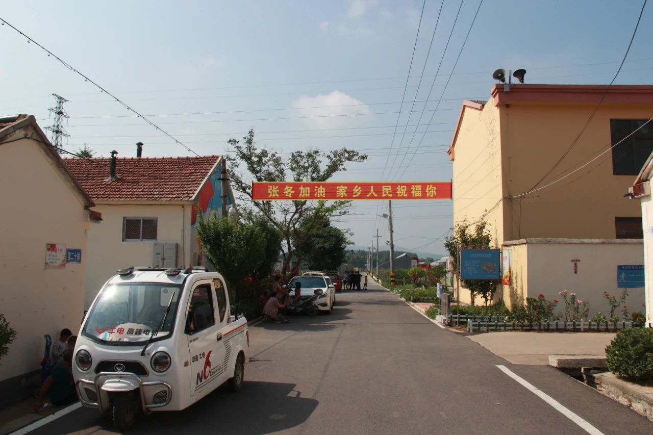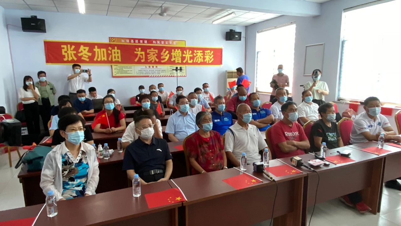 另一邊,在他家鄉(xiāng)濰坊市臨朐縣辛寨街道西半中村,掛滿了加油助威的條幅。在黨群服務(wù)站黨員活動室內(nèi),張冬的家人和鄉(xiāng)親們舉著國旗圍坐在電視前吶喊加油。