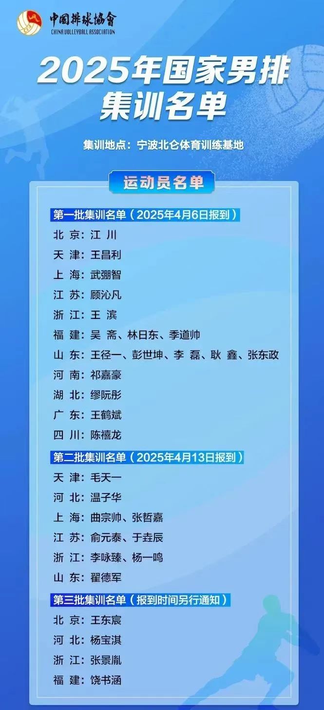 4月7日,中國(guó)男排2025年第一期集訓(xùn)在寧波北侖體育訓(xùn)練基地拉開帷幕。在此前公布的國(guó)家男排集訓(xùn)名單中,包括老將季道帥,以及王徑一、張東政和翟德軍4名由濰坊市體育運(yùn)動(dòng)學(xué)校培養(yǎng)輸送的隊(duì)員位列其中。季道帥、王徑一、張東政已隨隊(duì)開始了第一批集訓(xùn);翟德軍將于4月13日?qǐng)?bào)到參與第二批集訓(xùn)。