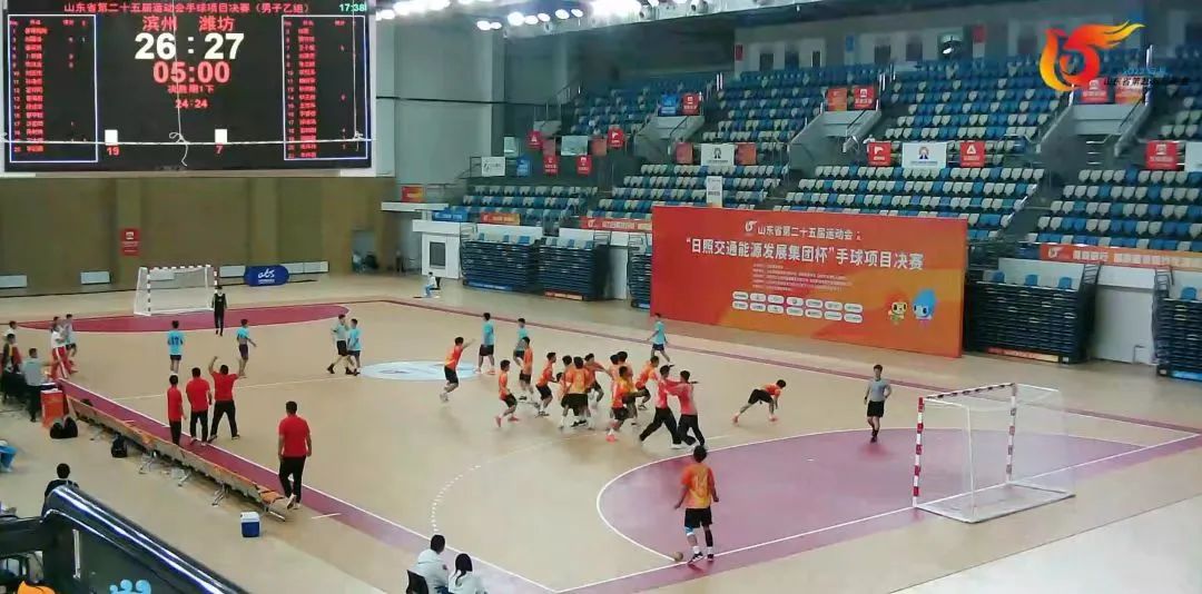 在男子乙組手球決賽中,濰坊隊對戰(zhàn)濱州隊。比賽一開始就進入膠著狀態(tài),雙方比分交替上升,并將比賽拖入加時賽,最終,濰坊隊的小將們頂住壓力,以27:26力克勁旅濱州隊,拿下男子乙組手球第一名,為濰坊代表團計入4枚金牌。而在男子甲組手球的比賽中,濰坊隊與淄博隊進行三四名的爭奪,最終,濰坊隊以35:31戰(zhàn)勝對手,獲得第三名,計入2.5枚金牌。